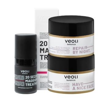 The set combines fragrance-free formulas with advanced active ingredients, i.e. peptides, acids, stem cells and caffeine for improved firmness, elasticity and a brighter look.