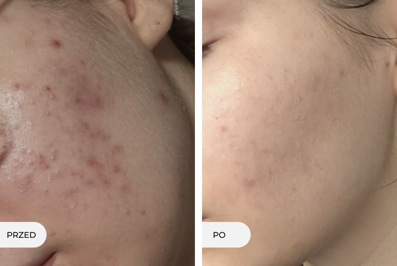 Po 12 tygodniach konsekwentnej, dobrze skomponowanej rutyny pielęgnacyjnej skóra Natalii przeszła wyraźną transformację. Zmniejszyła się ilość stanów zapalnych i zaskórników, a koloryt stał się bardziej jednolity, skóra nie jest już poszarzała, odzyskała gładką strukturę, blask i zdrowy wygląd. Co również jest istotne, wsparcie bariery hydrolipidowej sprawiło, że skóra jest mniej reaktywna i bardziej odporna na czynniki drażniące, co pozwoliło utrzymać efekty bez przesuszenia czy podrażnienia skóry.
