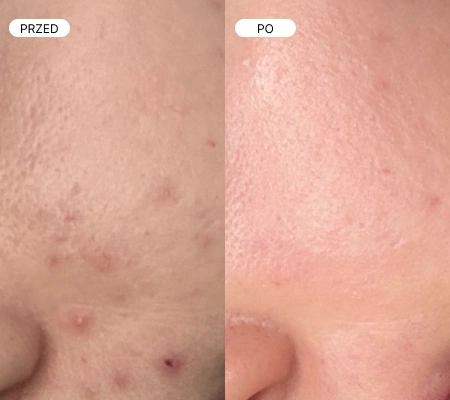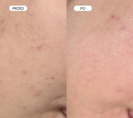 Już po pierwszym miesiącu regularnej pielęgnacji zauważyłyśmy, że skóra klientki zaczęła reagować zupełnie inaczej. Zmiany zapalne zaczęły się wyciszać, a uczucie napięcia i pieczenia po oczyszczaniu całkowicie zniknęło. Skóra przestała być reaktywna – nie występowało już szczypanie po nałożeniu produktów, co wcześniej było normą.