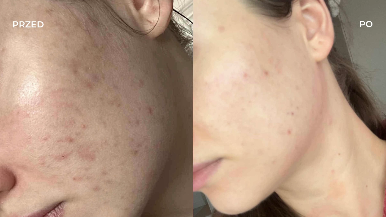 Po kilku miesiącach regularnego stosowania spersonalizowanej rutyny pielęgnacyjnej skóra Mai przeszła wyraźną metamorfozę. Najbardziej zauważalnym efektem jest redukcja przebarwień pozapalnych i znaczące wyrównanie kolorytu. Zmiany pigmentacyjne, które wcześniej były mocno widoczne, uległy rozjaśnieniu, a skóra prezentuje się jednolicie i świeżo.