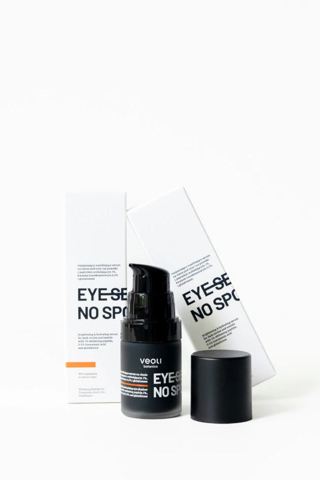 Co, jeżeli zmieniony kolor w okolicy oczu jest bardziej beżowo-brunatny, poszarzały i porusza się wraz ze skórą, nie jaśniejąc przy naciąganiu? Rozjaśniająco-nawilżające serum na cienie pod oczy i na powieki z peptydem wybielającym 1%, kwasem traneksamowym 0,5% i glutationem EYE SEE NO SPOTS to najlepszy wybór na zmiany zawierające pigment. Rozjaśnia, rozświetla, wyrównuje koloryt i zapobiega ciemnieniu i szarzeniu powiek.