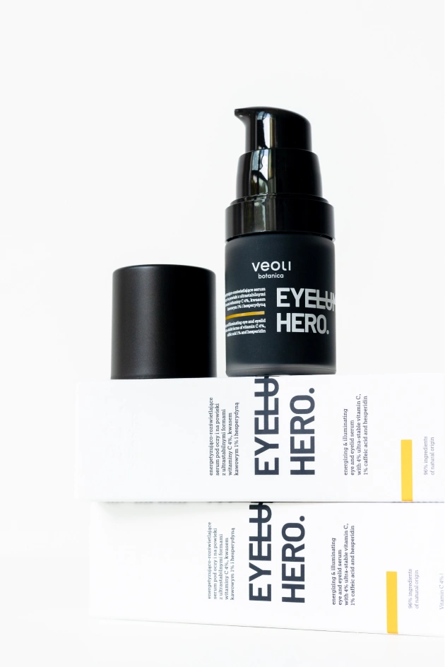 Jeśli Twoje cienie przybierają kolor fioletowy, niebieski, szary, czerwony, a w dodatku poruszają się pod palcami podczas unoszenia skóry – z pomocą przychodzi energetyzująco-rozświetlające serum pod oczy i na powieki z ultrastabilnymi formami witaminy C 4%, kwasem kawowym 1% i hesperydyną EYELUMINATE HERO – dla fanek witaminy C, ale również dla osób borykających się z nierównym kolorytem, czy opuchlizną.
