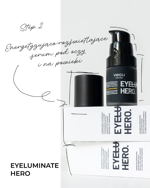 Energetyzująco-rozświetlającego serum pod oczy i na powieki z ultrastabilnymi formami witaminy C 4%, kwasem kawowym 1% i hesperydyną EYELUMINATE HERO to skoncentrowany shot witaminowy dla skóry wokół oczu. Skutecznie rozświetla, wygładza i poprawia wygląd okolicy oka, przywracając spojrzeniu energię. Serum łączy silne działanie antyoksydacyjne z formułą stymulującą mikrokrążenie, zapewniając rozświetlenie i regenerację nawet najbardziej zmęczonej skóry. To idealny wybór dla osób z oznakami zmęczenia, nierównym kolorytem, cieniami i obrzękami. Bezpieczne dla skóry wrażliwej, a także doskonałe jako baza pod makijaż!