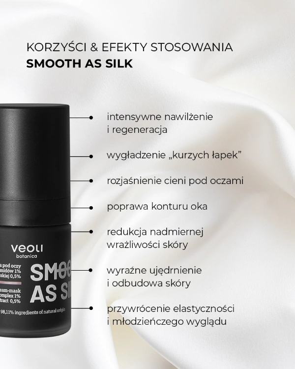 Naprawczo-ujędrniający krem-maska pod oczy z trehalozą 5%, kompleksem ceramidów 1% i ekstraktem z sosny nadmorskiej 0,5% SMOOTH AS SILK o bogatej formule, która pozostawia okluzyjną warstwę, zabezpieczającą naskórek, wygładza i regeneruje okolicę oczu oraz działa przeciwzmarszczkowo. Ten innowacyjny krem-maska silnie nawilża i wygładza, przywracając skórze wokół oczu elastyczność i młodzieńczy wygląd – redukuje cienie i widoczność zmarszczek, a także ma działanie rozświetlające.