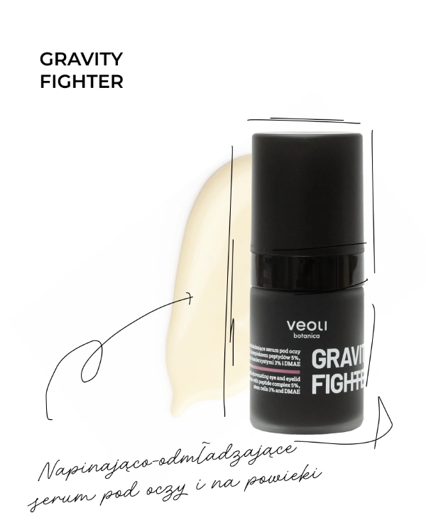 Napinająco-odmładzającego serum pod oczy i na powieki z kompleksem peptydów 5%, komórkami macierzystymi 3% i DMAE GRAVITY FIGHTER o silnie skoncentrowanej formule, stworzone, aby wyciszyć mimikę, napiąć skórę, przywrócić spojrzeniu jędrność i młodzieńczą wyrazistość. Efekt liftingu bez ingerencji? To serum redefiniuje pielęgnację przeciwzmarszczkową w okolicy oczu – redukuje opuchliznę i linie mimiczne, podnosi powiekę i wygładza kontur oka! Bezpieczne dla skóry wrażliwej, skuteczne jak zabieg. Idealne także pod makijaż – działa jak wygładzający primer!