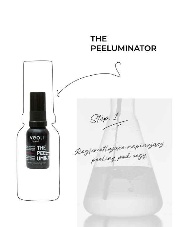 Rozświetlająco-napinający peeling pod oczy z kompleksem kwasów 6% i keratoliną 2% THE PEELUMINATOR jest odpowiedzią na potrzeby najbardziej wymagającej skóry wokół oczu. Ten zaawansowany peeling pod oczy został stworzony, by działać jak zabieg – dostępny w pielęgnacji domowej – nawilża i napina skórę poprzez delikatne złuszczanie oraz przygotowuje ją na przyjęcie składników aktywnych w kolejnych etapach pielęgnacji.