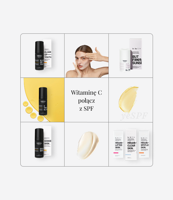 Dodatkowo witamina C rozjaśnia skórę i pomaga wyrównać koloryt, zmniejszając widoczność przebarwień. Należy jednak pamiętać, że sama witamina C nie chroni przed promieniowaniem UV. Dopiero połączenie jej z codziennym stosowaniem kremu z filtrem SPF zapewnia skuteczną ochronę przed fotostarzeniem, przebarwieniami i utratą jędrności skóry.