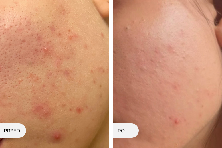 Przyczyną takiego stanu była przede wszystkim źle dobrana pielęgnacja, zbyt częste stosowanie kwasów i peelingów kwasowych, kosmetyki o silnym potencjale drażniącym oraz brak równowagi pomiędzy nawilżaniem, regeneracją a działaniem przeciwtrądzikowym. Skóra, zamiast być wzmacniana, była każdego dnia dodatkowo „atakowana”, co nasilało stan zapalny i jej nadreaktywność.