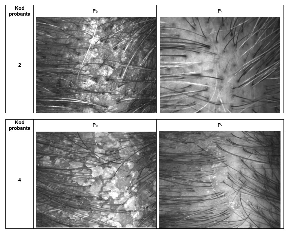 *Powyżej przedstawione zostały zdjęcia wykonane kamerą obrazujące stan skóry głowy i włosów. Na zdjęciach wykonanych po 2 tygodniach regularnego stosowania produktu widać widoczne zmniejszenie łupieżu.
